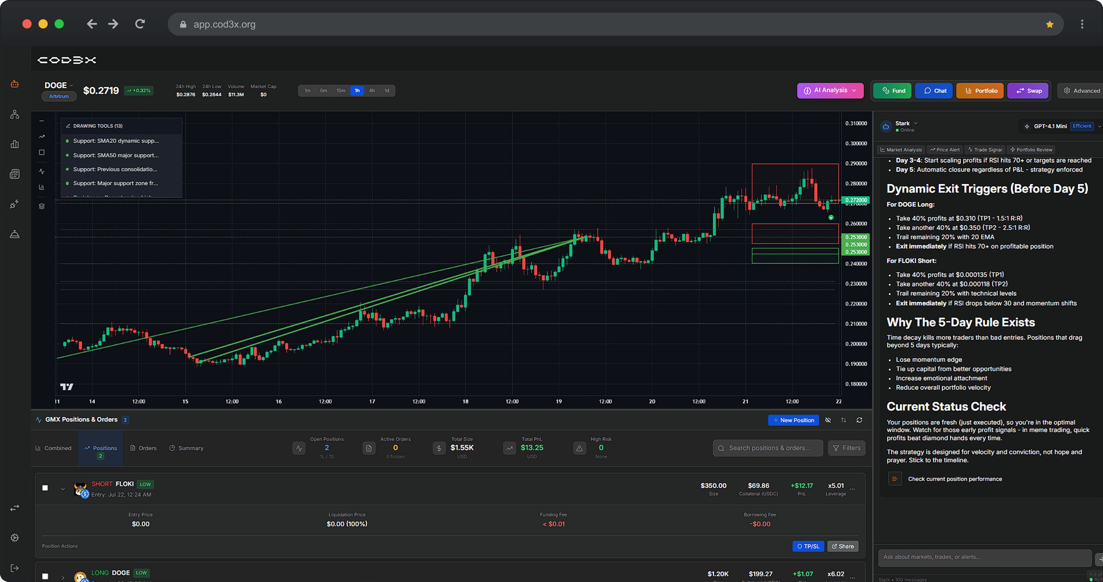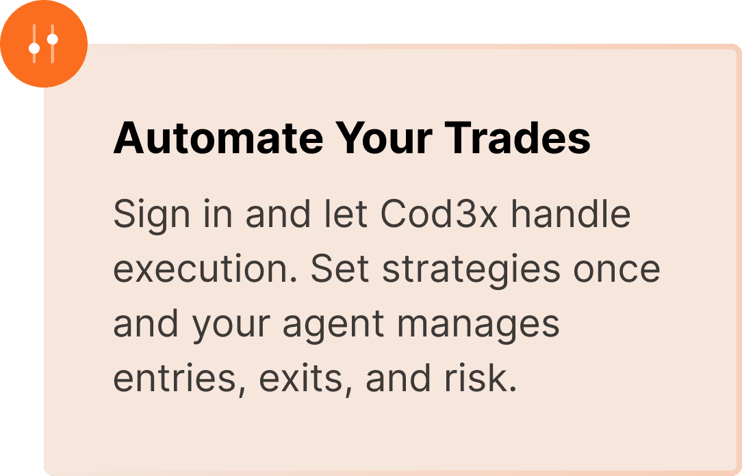 Launch an AI agent that trades like a pro, 24/7. Choose from existing agents or create your own. Deploy in minutes. Trade perps dynamically 24/7. Let Cod3x handle the execution. Adjust your strategies in a single click and gain an edge right out of the box. Your Cod3x agent enters, adjusts, and exits positions based on live market conditions β no babysitting needed. Cod3x analyzes price structure, trendlines, RSI/MACD, and draws levels for you β just ask or press a button. Choose between Claude Sonnet 4, GPT 4.1, Gemini or more models for better cost, smarter execution, or faster response β every trade powered by the model you trust. All your trades are executed on GMX V2 β with deep liquidity, leverage, and limit orders. Cod3x gives you access to hundreds of data points, the most powerful AI models, non-custodial security, and fully customizable data sources β all in one trading platform. Our event-driven architecture gives your agent ultimate control over context and execution. Powered by the latest technology from Anthropic, OpenAI, Google, DeepSeek, Grok and others. Secured by Moonβs air-gapped wallet technology. Your private vault β your private keys. Add your own data source in seconds: MCP – API – ABI – Langchain – GraphQL, etc. Talk to your agent about anything, define risk per trade, or ask the it to adjust positions through chat. Real-time market data and signals, powered by DexScreener and Cod3x. Spot setups without leaving the your terminal. AI-generated trade analysis with advanced TA, exit triggers, and tailored strategies β all in plain language. Track PnL, adjust leverage, or close positions instantly. Your trades update in real time. Weβre starting simple: one annual plan designed for traders who want it all. Have 100,000 CDX? You’re in for free. Create strategies, launch agents, trade automatically, and grow your portfolio in a community of traders and builders. DeFi security researcher turned CEO, overseeing billions in TVL since 2020. Realized AI would revolutionize yield products and founded Cod3x in 2022. Pioneer in generative audio with 10+ years of staff-level experience in AI and DevOps. Joined Cod3x in 2022 and built the first production DeFAI agent. Nearly 10 years in ML and mechatronics. Built neural networks as a CSIRO research engineer. Joined Cod3x in 2022 with the dream of automating his taxes. Professional composer turned music-tech entrepreneur turned product manager for Cod3x. Helps convert highly technical research into intuitive user experiences. Arbitrum (GMX V2) + more coming soon. Nope. You can start with a strategy template or ask the AI to build you one. It reads the charts, monitors positions, and executes trades for you β or with you. Yes. You can use Cod3x purely for alpha and TA, or go full-auto. We’re launching with a single tier for all users. No β Cod3x integrates Moon, which lets you start with just an email. Launch an AI agent that trades like a pro, 24/7. Choose from existing agents or create your own. Deploy in minutes. Trade perps dynamically 24/7. Let Cod3x handle the execution. Adjust your strategies in a single click and gain a market edge. Trade while you sleep. Your Cod3x agent enters, adjusts, and exits positions based on live market conditions β no babysitting needed. Let your agent do TA for you. Cod3x analyzes price structure, trendlines, RSI/MACD, and draws levels for you β just ask or press a button. You control the brain. Choose between Claude Sonnet 4, GPT 4.1, Gemini or more models for better cost, smarter execution, or faster response β every trade powered by the model you trust. Trade real markets with real tools. All your trades are executed on GMX V2 β with deep liquidity, leverage, and limit orders. Cod3x gives you access to hundreds of data points, the most powerful AI models, non-custodial security, and fully customizable data sources β all in one trading platform. Our event-driven architecture gives your agent ultimate control over context and execution. Powered by the latest technology from Anthropic, OpenAI, Google, DeepSeek, Grok and others. Secured by Moonβs air-gapped wallet technology. Your private vault β your private keys. Add your own data source in seconds: MCP – API – ABI – Langchain – GraphQL, etc. Talk to your agent about anything, define risk per trade, or ask the it to adjust positions through chat. Real-time market data and signals, powered by DexScreener and Cod3x. Spot setups without leaving the your terminal. AI-generated trade analysis with advanced TA, exit triggers, and tailored strategies β all in plain language. Track PnL, adjust leverage, or close positions instantly. Your trades update in real time. Weβre starting simple: one annual plan designed for traders who want it all. Have 100,000 CDX? You’re in for free. Create strategies, launch agents, trade automatically, and grow your portfolio in a community of traders and builders. DeFi security researcher turned CEO, overseeing billions in TVL since 2020. Realized AI would revolutionize yield products and founded Cod3x in 2022. Pioneer in generative audio with 10+ years of staff-level experience in AI and DevOps. Joined Cod3x in 2022 and built the first production DeFAI agent. Nearly 10 years in ML and mechatronics. Built neural networks as a CSIRO research engineer. Joined Cod3x in 2022 with the dream of automating his taxes. Professional composer turned music-tech entrepreneur turned product manager for Cod3x. Helps convert highly technical research into intuitive user experiences. Arbitrum (GMX V2) + more coming soon. Nope. You can start with a strategy template or ask the AI to build you one. It reads the charts, monitors positions, and executes trades for you β or with you. Yes. You can use Cod3x purely for alpha and TA, or go full-auto. We’re launching with a single tier for all users. No β Cod3x integrates Moon, which lets you start with just an email. Win more trades.